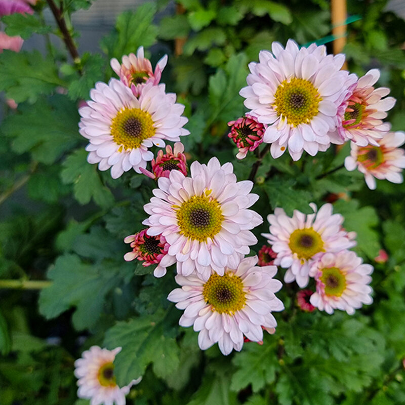 Crisantemo da reciso, fiore a margherita semidoppio bianco, leggermente rosato. Bordino fuchsia sottilissimo. Centro con macchia nera.