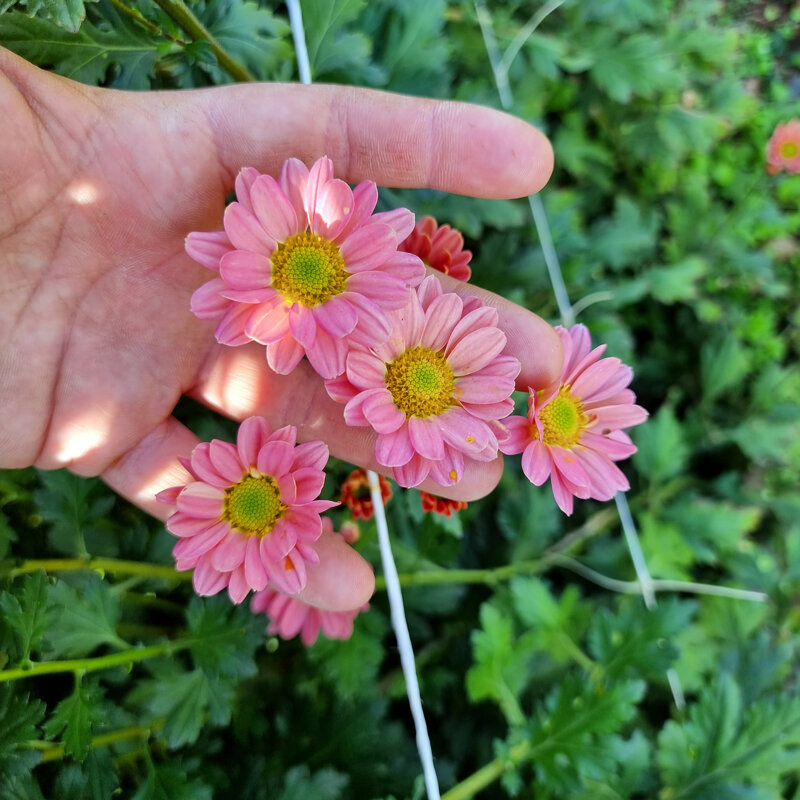 Chrysanthemum Rossi Smokey, da reciso, santini. Rosa medio, 'affumicato' quasi polveroso con sfumature calde vagamente aranciate, in margehrite semplici di circa 3 cm di diametro.La serie 'Rossi' vanta piante vigorose, generose ed affidabili,disponibili in sette differenti colori.