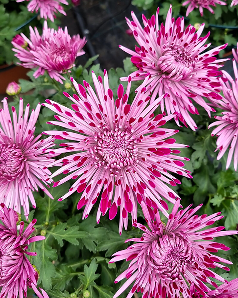Variet eccezionale. Fiori grandi a spillo con ligule aperte in punta. All'esterno il colore rosa lilla argentato, internamente porpora fuchsia.